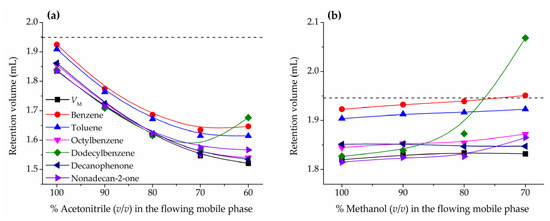 As already mentioned in the introduction, compounds such as benzene or toluene are commonly used as HILIC hold-up volume marker [5,11,18,40,41,42,43]. However, in a previous work it was found that these particular solutes are partially retained and larger solutes of the same type, such as octylbenzene and dodecylbenzene, should be more appropriate hold-up markers [24,35]. Figure 2a (acetonitrile) and Figure 2b (methanol) report the variation of the retention volumes of these markers with the mobile phase composition for acetonitrile/water and methanol/water mixtures, respectively, in the ZIC-HILIC column. Notice that in the plots are represented the mobile phase compositions corresponding to a HILIC behavior (down to 70% acetonitrile or 80% methanol) and the first percentage when mixed HILIC-RPLC starts to take place, which can be easily identified for an abrupt increase in the dodecylbenzene retention volume. For both organic solvents and eluent compositions typically used in HILIC applications, benzene and toluene are more retained than larger compounds, such as octylbenzene, dodecylbenzene, decanophenone, and nonadecan-2-one, which show similar retention volumes and in good agreement with the hold-up volume determined by the homologous series approach. These results are consistent with a HILIC retention mechanism based on the partition of solutes between the mobile phase and a hydroorganic stationary phase enriched in water partially immobilized on the chromatographic support. Benzene and toluene, although hydrophobic, are slightly soluble in water (1.8 and 0.5 g L−1 at 25 °C, respectively [44]), whereas the expected solubility of octylbenzene and dodecylbenzene is in the tens of µg L−1 range [45]. For any compound, since breaking water-water hydrogen bonding interactions to generate a cavity large enough to hold the solute is energy consuming, the higher the molecular volume, the lower the water solubility. Decanophenone and nonadecan-2-one are also insoluble in water, despite the contribution to polar surface area from oxygen atoms, with estimated solubilities not higher than 5 mg L−1 [45]. The tested compounds have molecular masses below 250 g mol−1 and roughly calculated volumes not exceeding 500 Å3. For instance, in the case of dodecylbenzene, a molecular volume of about 400 Å3 is compatible with a sphere of a diameter of about 9 Å or a more realistic cylinder with a length of 20 Å and a diameter of 5 Å [46]. These solute dimensions seem small enough to discard size exclusion effects in a column such the one used in this work with a porosity of 200 Å. However, the smallest benzenes due to their solubility in water might partition to some extent into the water-rich transition layers and therefore be retained by the stationary phase. Consequently, larger hydrophobic compounds appear to be a more convenient election for a hold-up volume marker in HILIC.