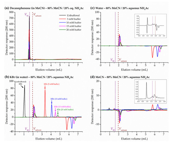 As presented in Figure 3 and discussed in Section 2.4., the peak disturbance created upon the injection of a pure solvent (water or acetonitrile) is not a reliable measure of hold-up volume. Nevertheless, in the absence of salts in the eluent, the elution volume of bromide was similar to the first solvent peak of water and acetonitrile. Since the retention of bromide depends on the ionic strength of the mobile phase, we decided to investigate the effect of ammonium acetate on the solvent peaks. Now, the first peak is observed just after Vsolvent (positive in the case of water, Figure 3c; negative for acetonitrile, Figure 3d) and a second peak beyond 5.5 mL (negative and positive, respectively). Whereas retention volumes of the first peak are nearly constant, the second one shifts to higher volumes with the concentration of buffer in the eluent. Interestingly, the peak areas corresponding to 5 and 10 mM are similar, and then the area is progressively reduced at 15 and 20 mM. This might be possibly related to the ion exchange properties of the zwitterionic bonded phase employed in this study [54]. In any case, in the presence of buffer in the mobile phase, the first disturbance peak appears beyond the Vsolvent, and therefore this method is definitely not suitable for the estimation of hold-up volumes.