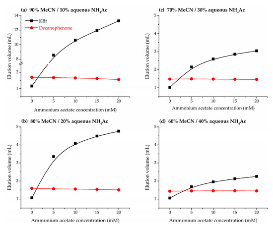 Variation of elution volumes of potassium bromide (black squares) and decanophenone (red dots) with the ammonium acetate concentration and the amount of acetonitrile (MeCN) in the mobile phase. Acetonitrile/aqueous buffer mixtures: (a) 90%, (b) 80%, (c) 70%, and (d) 60%.
