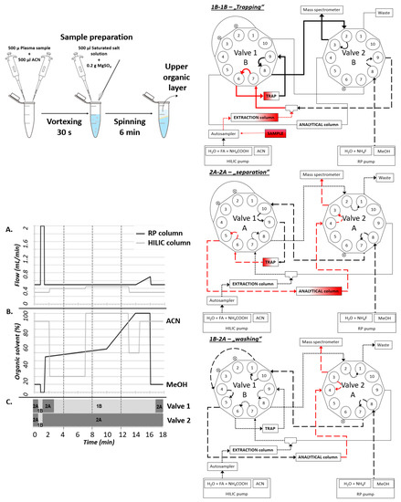 Analysis arrangement: The plasma sample is prepared by the modified QuEChERS-way in a two-step pre-treatment and directly injected into the system (10 min per sample). The target non-polar analytes are separated from the matrix on the extraction column (HILIC) and retained at TRAP (RP column) during the “Trapping” 1B-1B valve setting, while the interfering phospholipids are removed prior to the analytical separation. Subsequently, the analytes are washed out from TRAP, separated in the analytical column (RP), and analyzed in a mass spectrometer during the “Separation” 2A-2A valve setting. Finally, the entire system is reconditioned during the “Washing” 1B-2A valve setting—in total, the run takes 18 min. The flow (A) and composition (B) of particular mobile phases are depicted with respect to the actual valve setting (C) during the run.