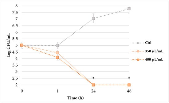 TKK results (Log CFU/mL) of S5 strain after 1, 24 and 48 h of exposition to 350 and 400 μL/mL of EAP solution. Asterisks mean statistically significant differences (* p < 0.05) between the cells treated with 350 and 400 µL/mL of EAP solution, compared to control cells.
