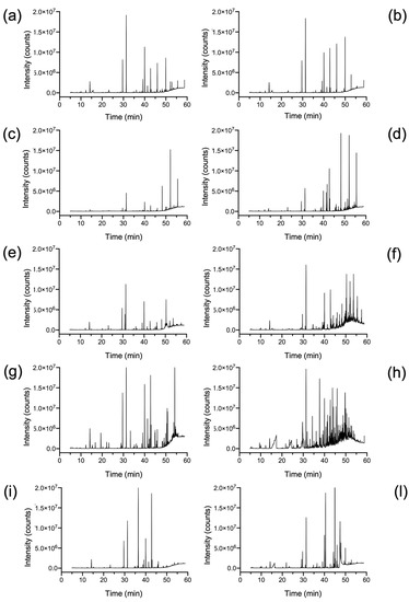 Total ion chromatograms of (a) PET (t0); (b) PET (t0 + 4 w); (c) HDPE (t0); (d) HDPE (t0 + 4 w); (e) LDPE (t0); (f) LDPE (t0 + 4 w); (g) PP (t0); (h) PP (t0 + 4 w); (i) PS (t0); and (l) PS (t0 + 4 w).