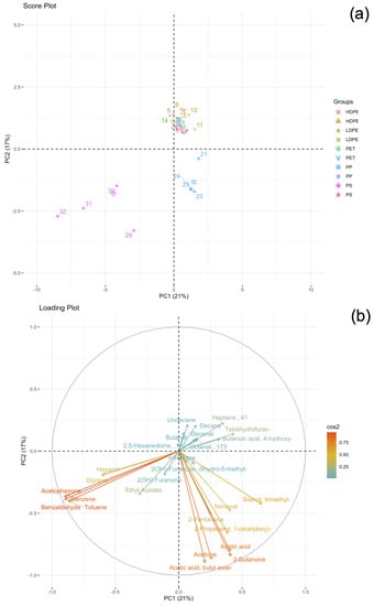 In PCA, the first principal component (PC1) and the second principal component (PC2) describe 38% of the total variance, confirming the complexity of the investigated system. From the score plot, it is possible to distinguish three clusters: (i) a first group of points in the bottom-left, (ii) a second group in the center-right, and (iii) a third group in the center. Interestingly, the first and second group belonged to PS and PP samples, whereas the third group combined the three remaining polymers (i.e., PET, HDPE, and LDPE). The loading plot allowed us to find the most important variables characterizing the PS and PP groups, suggesting the possibility to distinguish different aged polymers according to their VOCs profile. In fact, HiSorb-TD-GC-MS data suggested that degraded PS released significant amounts of the aromatic compounds acetophenone, benzaldehyde, toluene, and benzene, whereas aged PP showed acetic acid, acetone, 2-butanone, and 2-pentanone. Moreover, the occurrence of HDPE, LDPE, and PET in a single cluster close to the center of the score plot suggests a similar VOCs profile for these polymers.