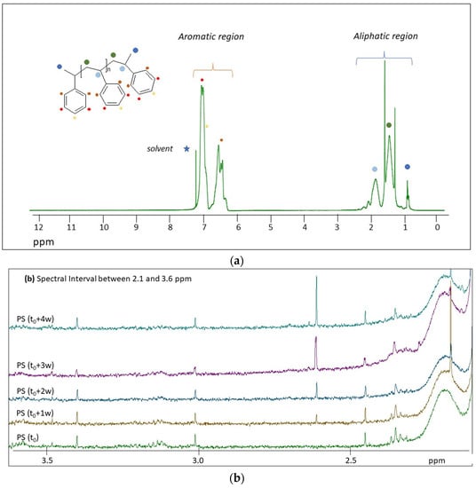 In this section, the main features of the 1H NMR spectra for the five types of polymer materials from the virgin sample to samples under different times of artificial photo-aging will be presented, following the order PS, PP, PET, HDPE, and LDPE.