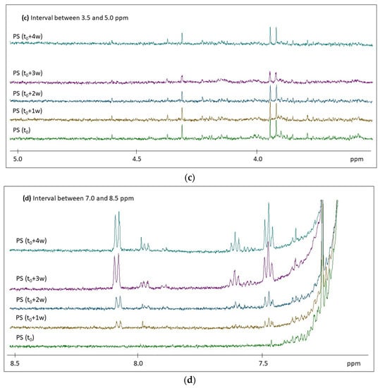 The analysis of the 1H NMR spectra of photo-oxidized PET is more complicated with respect to the previous polymers due to the presence of several signals in the region between 1 and 4 ppm and between 7.3 and 8.8 ppm which are present in all samples, from the pristine PET (t0) to the PET (t0 + 1 w, t0 + 2 w, t0 + 3 w, and t0 + 4 w) samples (see Figure 5). Moreover, some signals do not change their intensity, such as the singlets at 2.52 ppm and at 2.31 ppm, which can be ascribed to the -CH3 of acetophenone and 2-ketones. Some proton signals decrease their intensity during degradation, such as the triplet centered at 0.87 ppm which is due to terminal CH3 in ethyl groups which can be associated with many low molecular weight species released during PET degradation. As observed also from the HiSorb-TD-GC-MS results, in the case of PET, the small number of identified molecules is also reflected in the relatively simpler 1H NMR spectra, tentatively assigned to compounds such as nonanal, octanal, butanal, and butanone derivatives, as well as several benzene derivatives as detected by GC-MS.