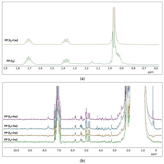 1H NMR signals due to specific products of degradation of PP are the singlets in the region between 4.65 and 4.85 ppm. As shown in Figure 9, some of these signals are ascribable to molecular species with CH- linked to the alcoholic function in 2-methyl 3-propanol derivatives, such as in isopropyl ethers or esters. The singlet at 4.68 ppm is due to CH2- of the 2-butanone acetate. Less intense and partially overlapped signals appear after 1 week of degradation in the region between 3.1 ppm and 4.2 ppm. Here, several characteristic compounds can be identified among typical products of PP degradation. For instance, the protons of CH2- linked to -OH in 3-methyl butanol resonate at 3.16 ppm (triplet) and those of the CH2- in acetyl acetone resonate at 3.56 ppm. If we look at the ratio between the intensity of these degradation products and the intensity of CH3- in pristine PP material, we cannot see significant changes between 1 w and 4 w, except for a few signals.