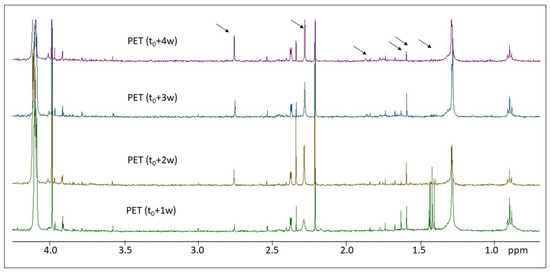Stackplot of the 1H NMR spectra of the PET microplastics at different times of irradiation (from bottom to top): t0 + 1 w, t0 + 2 w, t0 + 3 w, and t0 + 4 w, enlarged at the spectral baseline in the region between 0.6 and 4.3 ppm. Spectra were normalized with respect to the aromatic signal centered at 8.11 ppm due to the aromatic moiety of PET. Dark arrows indicate the most significant signals appearing or disappearing as a result of degradation.
