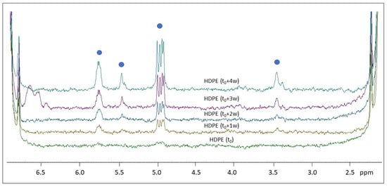 Stackplot of the 1H NMR spectra of the HDPE microplastics at different times of irradiation (from bottom to top): t0, t0 + 1 w, t0 + 2 w, t0 + 3 w, and t0 + 4 w, enlarged at the spectral baseline in the region between 2.0 and 7.0 ppm. Spectra were normalized with respect to the aliphatic signal centered at 1.3 ppm, due to the CH2 moiety of the HDPE chain. Blue circles indicate the most significant signals appearing as a result of degradation, as discussed in Section 3.