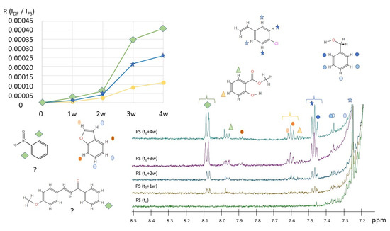 Enlargement of the 1H NMR spectra of pristine PS (t0) and PS after 1 w, 2 w, 3 w, and 4 w of degradation, from 7.2 to 8.5 ppm. Main 1H NMR aromatic signals have been assigned to compounds, whose molecular structure is shown. Hypothetical compounds are also reported as described in the text. The correspondence between each signal and the proton/protons on the molecular sketches is put in evidence through colored symbols. On the top left, the ratio R between the integral of the aromatic signals of PS (IPS) and the integral of the signals of degradation products (IDP), during the degradation time, from 0 (t0) to 4 weeks (t0 + 4 w) for three more significant signals, as indicated by the colored braces on top of the 1H NMR spectra.
