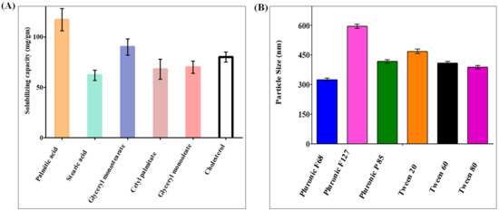 (A) Solubilizing capacity of DATS in palmitic acid, stearic acid, glyceryl monostearate, glyceryl monooleate, acetyl palmitate, and cholesterol. The data show that DATS had the highest solubilizing capacity in palmitic acid. (B) DATS SLNs was developed using Pluronic F-68, Pluronic F-127, Pluronic P-85, Tween 20, Tween 60, and Tween 80. The graphical data indicate that Pluronic F68 was the most suitable surfactant to produce minimum PS.