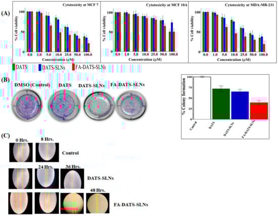 (A) Cytotoxicity studies in MCF-7, MCF-10A, and MDA-MB 231, and cell lines in vitro for 48 h. (B) MDA-MB-231 cell line colony formation assay. 1. Untreated cells (control); 2. cells treated with DATS; 3. cells treated with DATS-SLNs; 4. cells treated with FA-DATS-SLNs. The graphical representation indicates the % reduction of the colony formation compared with the control group (p < 0.01) after the treatment. (C) MDA-MB-231 cell migration assay for the formulation of DATS, DATS-SLNs, and FA-DATS-SLNs.