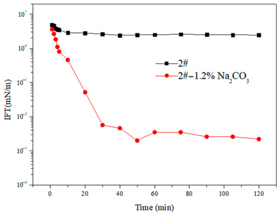 As can be seen in Figure 2, ultra-low interfacial tension was not attained by viscosity reducer 2# without Na2CO3. When 1.2% Na2CO3 was added to the system, the interfacial tension of the system greatly decreased to 4.60 × 10−3 mN/m at 25 min and was kept in the ultra-low interfacial tension range the whole time.
