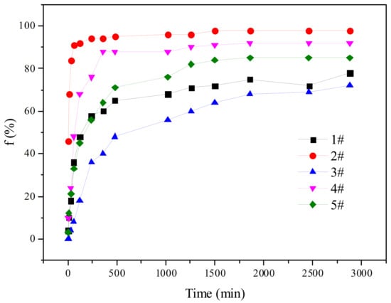 The water separation rate is an important parameter for characterizing emulsion stability. The lower the water separation rate, the more stable the emulsion. Figure 3 shows that under the same experimental conditions, all five viscosity reducers reached the water separation equilibrium time within 1 day but the maximum water separation rate was very different. The order of the maximum water separation rate fmax was 2# > 4# > 5# > 1# > 3#.