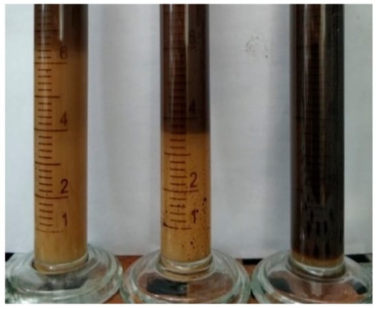 Figure 5 shows the emulsion state of the 3# viscosity reducer at 48 h. From left to right, the oil–water ratio was 3:7, 5:5, and 7:3. It can be seen that the volume of o/w emulsion gradually decreased with the increase of the oil–water ratio and the emulsion changed from o/w to w/o. In particular, when the oil–water ratio was 7:3 the solution was a very stable w/o emulsion.