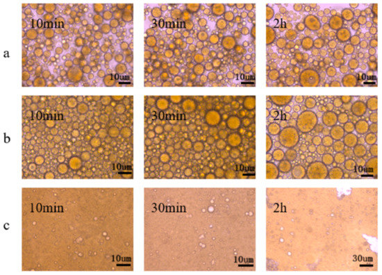 The unstable demulsification process of the emulsion was observed using a bioluminescence microscope. A total of 2 μL of emulsion was immediately placed on a glass sheet, and the microscopic state of the emulsion was observed after 10 min, 30 min, and 2 h under a bioluminescence microscope at 200 times magnification.