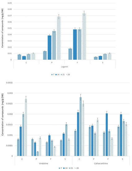 HPLC analysis of the effect of fungicide treatments (Pronto Plus (P), Folicur (F), and Switch (S)) compared to the untreated (control, C) on the concentration of loganin, catharanthine, and vindoline accumulation in Catharanthus roseus. The numbers correspond to harvesting time (7, 14, 21, and 28 days after treatment) and the letters to fungicides (P—Pronto Plus, F—Folicur and S—Switch) and control—C. Data present the average and standard deviation of triplicates for each time point of each condition.