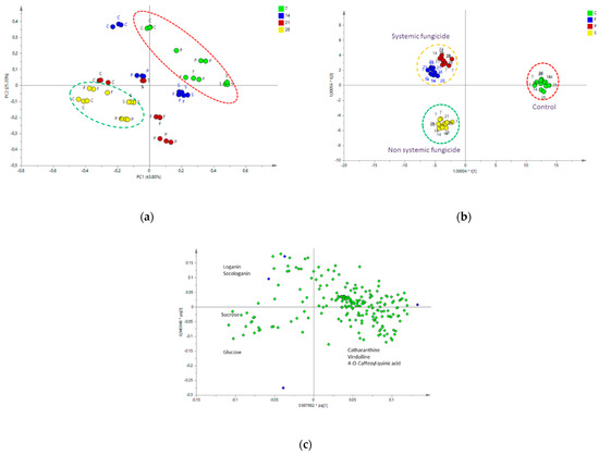 (a) Score scatter plot showing result of the PCA with all of the seedling samples. The numbers correspond to harvesting time (7, 14, 21, and 28 days after treatment) and the letters to fungicides (P—Pronto Plus, F—Folicur, and S—Switch) and control—C. (b) Score scatter plot showing result of the OPLS-DA with all of the seedling samples. (c) OPLS-DA loading scatter plot.