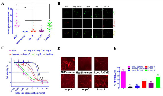 Serum samples from 20 AQP4-IgG-seropositive patients were used in this study. AQP4 extracellular epitope peptides were dissolved at 1 mg/mL. Peptide solutions (Loop A:C:E at 1:1:1, or Loop A, Loop C, or Loop E alone) were then mixed with patient serum at a ratio of 1:10 and incubated at 4 °C for 1 h. BSA was used as a negative control. The AQP4-IgG concentration was measured using the aquaporin-4 (AQP4) autoantibody ELISA Kit (RSR Limited, Cardiff, UK). The mixture of Loop A + C + E mimotope peptides significantly reduced the AQP4-IgG concentration detected by ELISA (Figure 1A). When used alone, all three epitope peptides, especially the Loop A and Loop C peptides, significantly reduced the detectable AQP4-IgG concentration (Figure 1A).