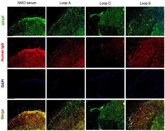 - Hinson, S.R.; Pittock, S.J.; Lucchinetti, C.F.; Roemer, S.F.; Fryer, J.P.; Kryzer, T.J.; Lennon, V.A. Pathogenic potential of IgG binding to water channel extracellular domain in neuromyelitis optica. Neurology 2007, 69, 2221–2231. [Google Scholar] [CrossRef] [PubMed]