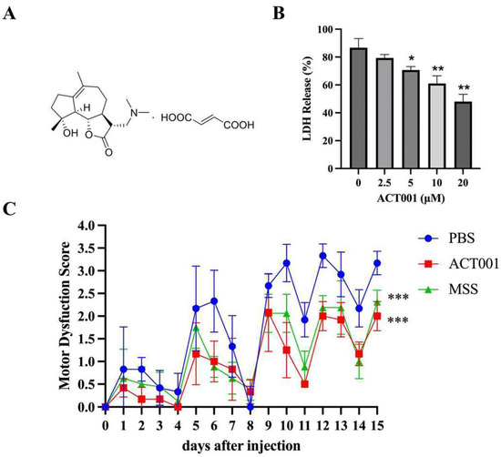 ACT001 reduces the damage caused by autoimmunity antibodies in vivo and in vitro. (A) ACT001′s chemical structure formula. (B) LDH release in astrocytes by AQP4-IgG with or without ACT001 treatment. * and ** represent p < 0.05, and p < 0.01, respectively. (C) NMOSD model behavior test of the PBS, MSS, and ACT001 treatment groups within 15 days. The significance level was expressed as follows: *** represent p < 0.001.