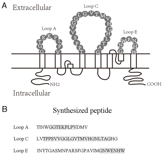 AQP4 extracellular epitopes and synthesized peptides. (A) Schematic representation of human AQP4 residues constituting extracellular Loops A, C, and E. (B) Synthesized AQP4 extracellular mimotope peptides.