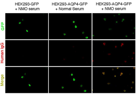 DNA constructs encoding full-length human AQP4 M23 isoforms were generated by PCR amplification using whole-brain cDNA as a template. M23 AQP4 isoform PCR fragments were linked with a GFP tag, ligated into mammalian expression vector pcDNA3.1, and fully sequenced. HEK293 cell cultures were maintained at 37 °C in 5% CO2/95% air in Eagle’s minimum essential medium containing 10% fetal bovine serum, 100 units/mL penicillin, and 100 μg/mL streptomycin. Cells were grown on glass coverslips and transfected with DNA in an antibiotic-free medium using Lipofectamine 2000 (Invitrogen. Carlsbad, CA, USA) according to the manufacturer’s protocol. A pcDNA3.1 vector containing only GFP was transfected as a negative control. Stable AQP4-GFP-expressing, or GFP-expressing clones, were selected following enrichment in Geneticin (Invitrogen. Carlsbad, CA, USA) and plated in 96-well plates at a very low density. Before IgG binding, cells were washed 3 times with normal saline, fixed with 4% paraformaldehyde at 4 °C for 15 min, and then washed another 3 times. Fixed cells were stored at 4 °C in normal saline for several weeks.