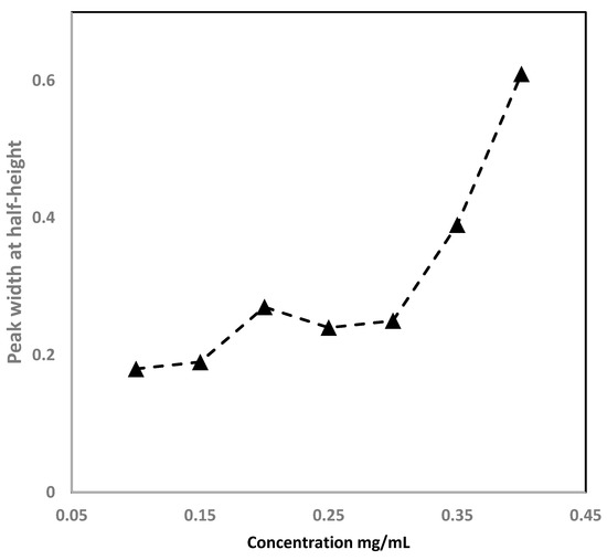 Column loading capacity can intensely affect peak shape because the surface area of the column plays a crucial role. The capacity depends on the inner diameter of the column. The sample loading on the separation of CoQ10 was investigated by injecting the various concentrations of CoQ10, ranging from 0.05 to 5 mg/mL, while the injected sample volume of 20 nL was applied. The loading capacity for CoQ10 was found to be 0.4 mg/mL. It was obtained using the corresponding peak width at half-height (W1/2) while increasing by 10% over the peak width at a small sample volume. Figure 7 shows the test results of a 15 cm, LMA-based monolith. As is shown here, the W1/2 for CoQ10 at 0.4 mg/mL increased by 25% over the peak width. These results exhibited a good loading capacity of the monolith for the separation of CoQ10.