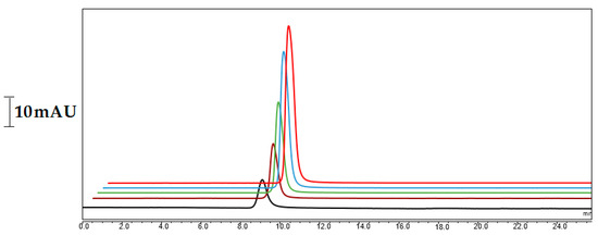 In order to optimize the conditions, several parameters, such as the mobile phase content, flow rate, and injection volume, were investigated, while some others were replaced due to the use of hydrophobic compounds, according to published literature. In this sense, CoQ10 could be well dissolved in several solvent systems such as can:2-PrOH or MeOH:2-PrOH, while EtOH:2-PrOH is not suitable in nano-LC because of the low flow rate applied (e.g., 500 nL/min). Considering the published literature [9,10], the solvent system with MeOH:2-PrOH:EtOH was tested at various ratios. The ratio of each solvent was then selected as MeOH:2-PrOH:EtOH (2:1:1%, v/v), respectively. An ultrasound sonicator (BANDELIN, KE76 probe) homogenizator was used for the sample preparation in order to obtain homogeneous samples (see Figure S1). It is noteworthy that the use of the ultrasound tip sonicator for the sample preparation allowed for a better homogeneous solution, leading to the good analysis of CoQ10 in the pistachio samples. As is shown in Figure S2, the samples could be successfully prepared before their injection to the nano-LC system. As a hydrophobic agent in the structure of the monolithic column, LMA provided hydrophobic interactions. Therefore, the monolith strongly interacted with CoQ10, allowing for its retention under neutral conditions. Various flow rates, ranging from 300 nL/min to 800 nL/min, were applied for the separation of the CoQ10 in nano-LC. This was evaluated with the one-by-one injection of the CoQ10 standard. The chromatographic separation conditions could be selected with the prepared monolithic nano-column using the mobile phase containing 2:1:1% (v/v) MeOH/EtOH/2-PrOH at a flow rate of 500 nL/min. The nano-LC-UV chromatograms demonstrated maximum absorption values at around 275 nm. Although various detection wavelengths, such as 210 and 278, were attempted, a stable baseline for CoQ10 was found at 275 nm, which was consistent with the literature [24]. The kinetic curves obtained in the presence of different CoQ10 concentrations (see Figure 8) showed a good retention of CoQ10 on the monolithic column.