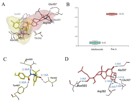 By further analyzing the mutual mechanism of the two pockets, we found that there is an overlap between these two pockets, and Asn503 in this region is also able to form a common H−bond with a distance of 2.96 Å to both ligands (Figure 4A). This suggests that Asn503 is an important amino acid for the binding of PxEcR to both ligands. In addition, tebufenozide also exhibits hydrogen bond interactions with Tyr407 and Thr342, and the force of action is mainly concentrated on the backbone structure (Figure 4C). PonA was able to form more hydrogen bonds with the surrounding Glu307, Arg382, and Ala397 due to its five hydroxyl and one carbonyl groups (Figure 4D). Notably, Glu307 and Arg382 formed a hydrogen bonding network with the two hydroxyl groups in the tail of PonA, which made the binding of PonA to the pocket more stable.