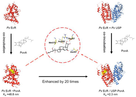 To further evaluate the biological activities and binding patterns of the target proteins (PxGST−EcR and PxGST−USP) after exogenous expression purification, we tested the binding of the two target proteins to the natural ecdysteroid [3H]PonA in different combinations, as shown in Figure 3A. The experimental results showed that [3H]PonA did not bind to the monomeric protein PxGST−USP (i.e., there was no significant difference between total and nonspecific binding) but bound specifically to PxGST−EcR; in addition, the binding of PxGST−EcR to [3H]PonA was significantly enhanced in the presence of PxGST−USP (PxGST−EcR and PxGST−EcR/USP dimer-specific binding of 345 dpm and 1179 dpm, respectively) by approximately four-fold (Figure 3A), which was consistent with previous tests [21,30].