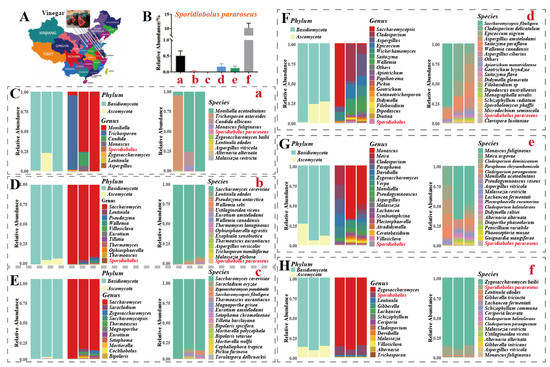 Source and distribution of Sporidiobolus pararoseus in vinegar. (A) Sampling map of vinegar samples. (B) Relative abundance of S. pararoseus in vinegar samples. (C–H) ITS sequencing results of six vinegar samples.