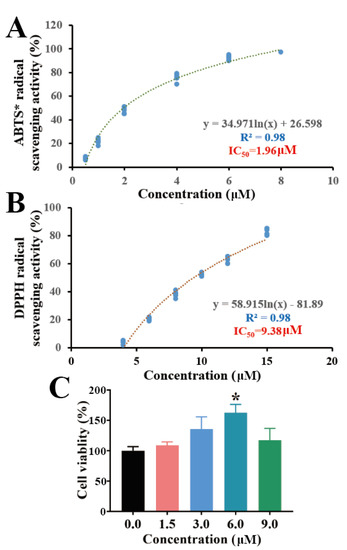 In ABTS (2,2’-azino-bis(3-ethylbenzothiazoline-6-sulfonic acid)* radical, first, ABTS radical cation (ABTS*) solution was prepared by mixing 7 mM ABTS solution with an equal amount of potassium persulfate. The obtained mixture was mixed and stored in the dark at 4 °C for 15 h. After the ABTS* solution was diluted with absolute ethanol, the absorbance at 30 °C and 734 nm was 0.70. Then, the sample was mixed with the ABTS* solution (1:9) and reacted for 10 min, measuring the absorbance at 30 °C and 734 nm. The DPPH free radical scavenging experiment is to mix the samples at different concentrations with DPPH (0.04 mg/mL) diluted with methanol. After the samples were reacted for 30 min, the absorbance was measured at 517 nm at room temperature in the dark. The free radical scavenging activity formula is as follows: