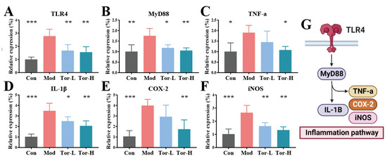Effect of torularhodin on the RAW 264.7 inflammatory cell model. (A) Relative expression levels of TLR4. (B) Relative expression levels of MyD88. (C) Relative expression levels of TNF-a. (D) Relative expression levels of IL-1β. (E) Relative expression levels of COX-2. (F) Relative expression levels of iNOS. (G) TLR4 inflammatory pathway. Significant differences between Mod group and other groups: * p < 0.05, ** p < 0.01, *** p < 0.001.