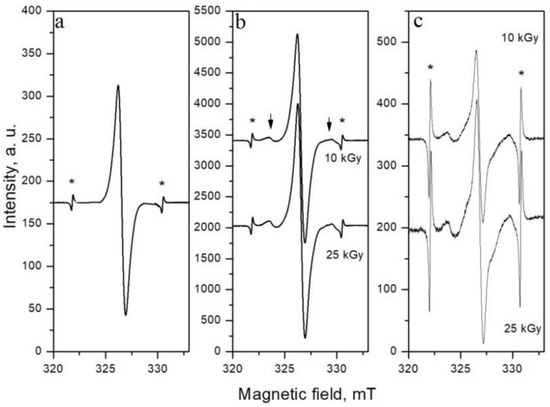 Non-irradiated shell sample of almonds shows one singlet line characterized with a g-factor of 2.0026 (Figure 1a). This line is observed in all non-irradiated foodstuffs of plant origin and is attributed to the free radicals of semi-quinones, produced by oxidation of plant phenolic groups present in polyphenols or lignin [17]. Almond samples irradiated at 10 and 25 kGy exhibited a typical “cellulose-like” EPR spectrum containing an irradiation-specific line pair of the cellulose radical (satellite lines marked with arrows in Figure 1b, assumed to arise from the C(5) carbon-centered cellulose radical [18]), spaced about 6 mT from each other, and increased intensity of the central line. The presence of the characteristic “cellulose–like” EPR spectrum is considered in EU Standard 1787 as unambiguous evidence for the previous radiation treatment of plant foodstuffs [19]. The second radiation induced signal appeared as a strong singlet with g-factor of 2.0055 and overlapping with natural weak line and “cellulose-like” EPR spectrum. This admission for a second radiation-induced EPR singlet line was confirmed by the different decay rate constant of the disappearance of the two radiation-induced features [20,21]. In addition, the spectrum of Mn2+ ions was observed (marked with asterisks in Figure 1), whose fifth line overlapped with the right satellite line. This manganese spectrum confirmed the presence of a high amount of this mineral in almonds. As can be seen in Figure 1c, 250 days after irradiation, the central line significantly decreased, compared to satellite lines, but the latter was still visible. When the satellite lines disappeared, the manganese spectrum could be used as an internal naturally present standard for the identification of gamma-sterilization [22]. Thus, gamma irradiation did not induce a large difference in the amount of free radicals at 10 and 25 kGy doses, since no significant difference in intensity of EPR spectra was observed. These results could be explained by the saturation of the signal at higher doses or a higher extent of the recombination of the free radicals because of the large number of closer-situated radicals in the 25 kGy samples.