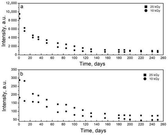 In order to establish the time stability of the radiation-induced EPR signals, their decay kinetics were studied for a period of 250 days after the irradiation of the almonds. According to the results, the main EPR signals decayed exponentially with time, with a slightly higher intensity in the 25 kGy irradiated samples than that of the 10 kGy dose (Figure 2a). Similarly, the satellite lines were more visible for almonds irradiated with 25 kGy, and this trend persisted until the end of the study (Figure 2b). The kinetic investigation revealed that the central line decreased by about 90%, while the satellite lines decreased by about 73%. The different behavior of central and satellite peaks proved the case for at least two radiation-induced signals. No significant difference in the kinetic behavior for almonds irradiated at 10 and 25 kGy was observed.