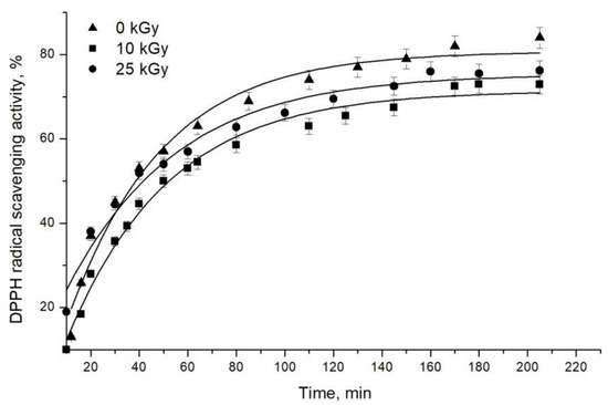 The time dependence of 1,1-diphenyl-2-picrylhydrazyl (DPPH) free radical scavenging activity of irradiated (10 and 25 kGy) and non-treated defatted almonds is presented in Figure 3. As can be seen, a gradual increase in the antiradical activity over time was established. Up to about 40 min, the dependence was linear, whereas after approximately 160 min, a plateau was formed. The results show that the irradiation FRSA decreased by 9% and 4% in samples from almonds irradiated by 10 and 25 kGy, respectively. Many authors designate a strong connection between the content of nut phenolics and antioxidant abilities [23,24]. In accordance with our study, Moosavi et al. reported the decreasing of the radical scavenging capacity of almond hull extracts after gamma irradiation with 6 and 10 kGy, probably due to the reduction in tannin content [23]. In contrast, Harrison and Were observed an increase of phenolic content and antioxidant capacity in irradiated almond skin extracts, compared to non-irradiated ones [25].