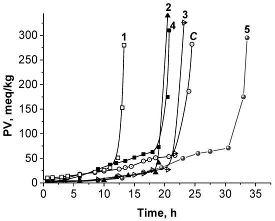 Regarding the initial oxidation rate, the control and irradiated samples had the same value for R (0.3 × 10−6 M/s, Table 4). The addition of ascorbyl palmitate to gamma-treated oil resulted in the decreasing of R, as opposed to its mixture with tocopherol. So, in spite of practically the same induction periods (Figure 4, curves 2 and 4), the 0.5 mM AscPH individually ensured a 2.5-fold lower oxidation rate, compared to that in the mixture with TOH (Table 4). In other words, the additional enrichment with alpha-tocopherol, in this case, did not lead to a better stabilization of oxidizable lipid substrate.