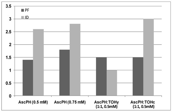 Protection factor (PF) and inhibition degree (ID) of stabilized gamma-irradiated samples with ascorbyl palmitate (AscPH) at 0.5 mM and 0.75 mM, as individuals and in equimolar mixture with alpha-tocopherol (TOH; AscPH: TOHγ), compared with PF and ID of the stabilized control sample (AscPH: TOHC).