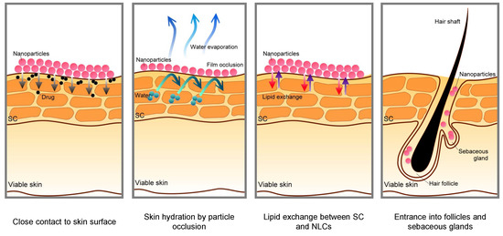 Schematic mechanisms for skin permeation of active components from nanoparticles [29].