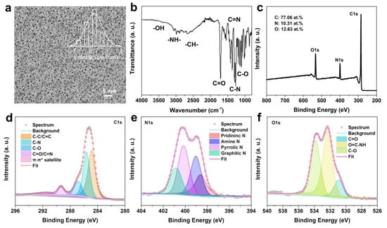 Figure 3. (a) TEM image and its corresponding lateral size distribution, (b) FT-IR spectrum, (c) survey XPS spectrum, (d) high-resolution C1s spectrum, (e) high-resolution N1s spectrum, and (f) high-resolution O1s spectrum of N-CDs.