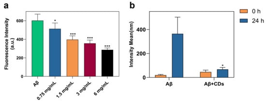 Figure 4. Aβ1–42 aggregation was inhibited by N-CDs. (a) The thioflavin T fluorescence intensity in the presence or absence of N-CDs at the concentration of 0.75, 1.5, 3, and 6 mg/mL after 24 h incubation. *** p < 0.001, * p < 0.05 vs. Aβ1–42 alone (1st column). (b) DLS spectra of Aβ1–42 peptide with or without N-CDs (6 mg/mL) at the beginning and after 24 h incubation. The aggregation of the Aβ1–42 peptide was inhibited in the presence of N-CDs after 24 h incubation compared with the free Aβ1–42 peptide (* p < 0.05).