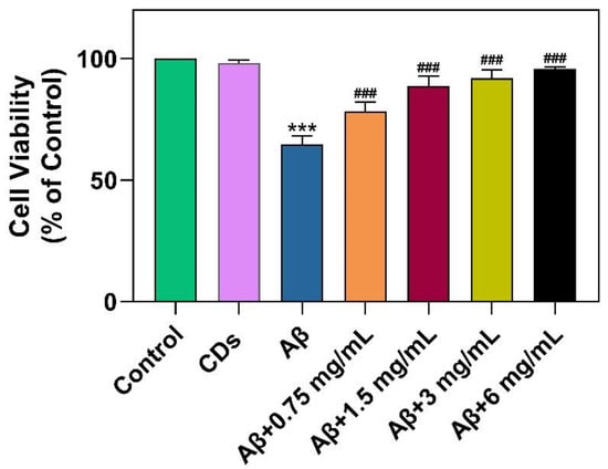 Figure 6. Effect of Aβ1–42 peptide (100 µM), N-CDs (6 mg/mL), or Aβ1–42 (100 µM) mixed with N-CDs at the concentration of 0.75, 1.5, 3, and 6 mg/mL on the viability of N2a cells after 24 h of incubation. (*** p < 0.001 vs. Control; ### p < 0.001 vs. purely Aβ1–42-treated group).