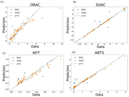 Prediction results at five regression tasks. The orange markers show training data, whilst the blue ones show the prediction of test data. The blue lines indicate where the plots are located when the predictions were correct. (a) The prediction performance when the ORAC dataset was used. (b) The prediction of SOAC values. (c) The prediction of MTT values. (d) The prediction of TEAC values included in the ABTS dataset.