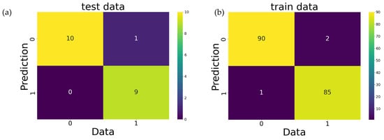 The machine learning models used here were screened from nine algorithms using EvalML [28], an automated machine learning library. Because extreme gradient boosting (XGBoost) [29] showed stable predictive performance, it was used as an algorithm for supervised learning models. XGBoost is a tree structure-based algorithm wherein branches are generated by the relationship between feature values and thresholds, outputting predictions at the ends. During training, the model is improved by sequentially adding tree structures, such that the difference between predictions and true values approaches a minimum. The evaluation metrics for the prediction performance of XGBoost models are listed in Table 3. Smaller values for mean absolute error (MAE), root-mean-square error (RMSE), and MAE divided by the standard deviation (MAE/STD) used in the regression task evaluation indicated a stronger prediction performance. For the classification task evaluation, a lower binary cross-entropy and higher accuracy also indicated a better prediction. Plots consisting of the data and predicted values are shown in Figure 2a–d, whilst the confusion matrix of both the training and the test data for the classification task is shown in Figure 3a,b. It was confirmed that the predictions obtained from XGBoost in this study did not deviate from the actual values observed in the data.