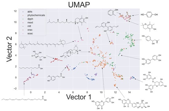 Distribution of compounds related to antioxidant capacity and assay produced by UMAP.