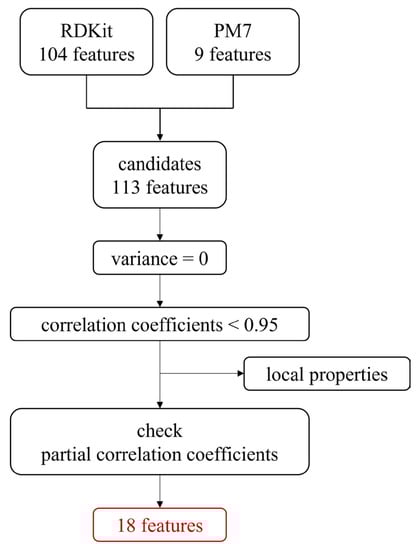 The method of feature selection. There were four steps for reducing features. Variance and correlation coefficients were used as the threshold values in the first two steps. Then, in the third step, discrete features, or local properties in a molecule, were dropped. Partial correlation coefficients were subsequently used as the threshold values in the last step.