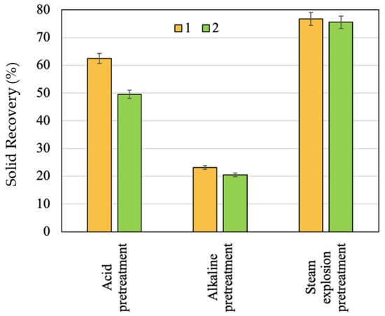 Effect of pretreatments on solid recovery: 1—apricot seed shells; 2—walnut shells.