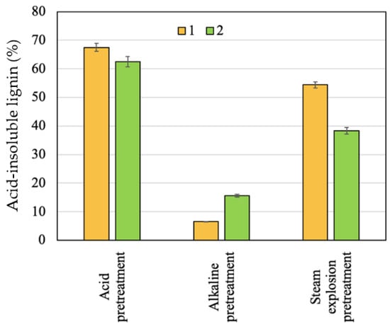 Effect of pretreatments on residual lignin content: 1—apricot seed shells; 2—walnut shells.