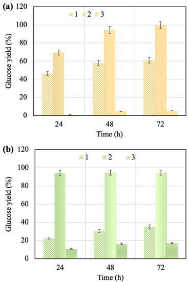 Effect of time on glucose yield during enzymatic hydrolysis of pretreated apricot seed shells (a) and walnut shells (b): 1—after acid pretreatment; 2—after alkaline pretreatment; 3—after steam explosion pretreatment.