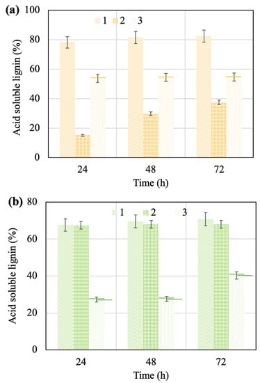 Effect of time of the process on amount of acid-soluble lignin in solids after hydrolysis of materials based on apricot seed shells (a) and walnut shells (b): 1—solid after acid pretreatment; 2—solid after alkaline pretreatment; 3—solid after pretreatment with steam explosion.